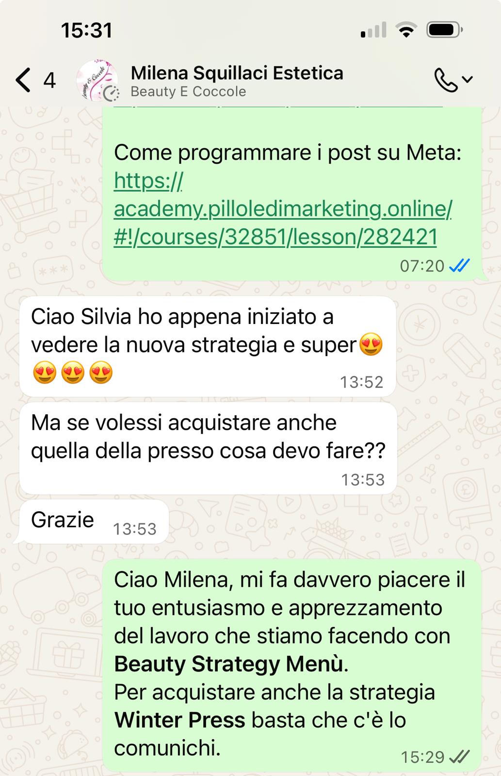 Accanto a questo, trovi il mio corso di marketing e vendita, dove ti mostro in modo semplice come presentare la strategia, cosa dire alle tue clienti e come usarla per portare risultati.