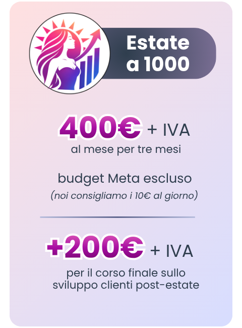 Estate a 1000 è il programma che ti permette di generare una rendita passiva di almeno 2000€ al mese, senza fare straordinari o assumere nuovo personale (anche se hai già l'agenda piena).